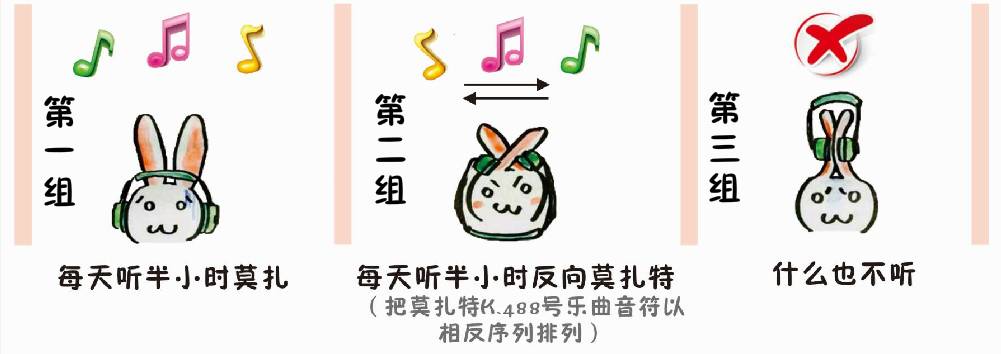 结果发现:听了莫扎特音乐的一组,空间记忆能力比不听的好;不听的一组,又比反向听的好。