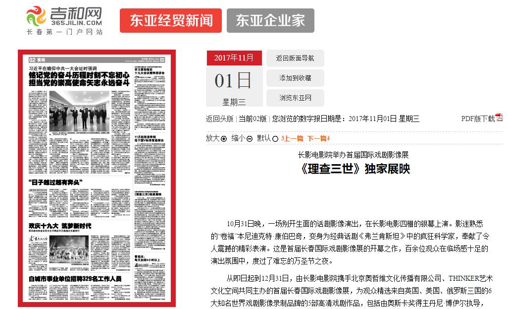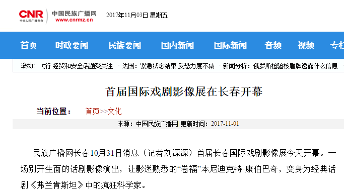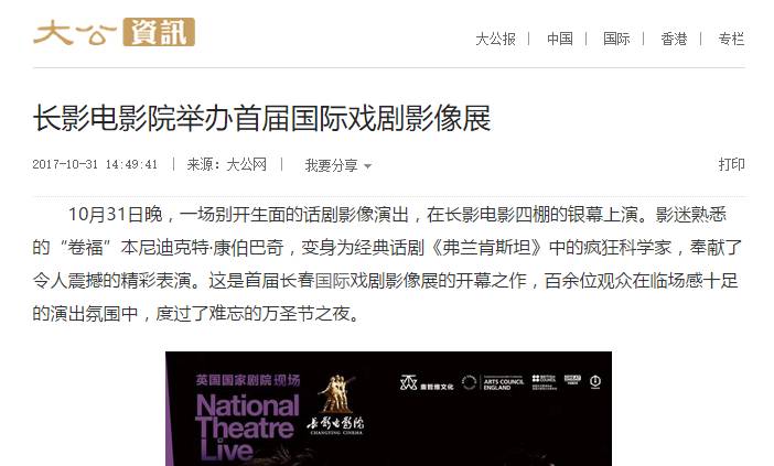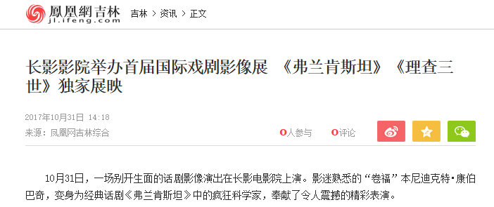 从即日起到12月31日,由长影电影院携手THINKER艺术中心、北京奥哲维文化传播有限公司共同主办的首届长春国际戏剧影像展,为观众精选来自英国、美国、俄罗斯三国的6大知名世界戏剧影像录制品牌的5部高清戏剧作品,包括由奥斯卡奖得主丹尼·博伊尔执导,本尼迪克特·康伯巴奇和约翰尼·李·米勒交替演出科学家维科多·弗兰肯斯坦和他创造出的科学怪人的《弗兰肯斯坦》,“万磁王”伊恩·麦克莱恩、“X教授”帕特里克·斯图尔特主演的《无人之境》,同名电影横扫奥斯卡八项大奖的《莫扎特传》,电影《灰姑娘》班底打造的莎翁经典爱情悲剧《罗密欧与朱丽叶》,以及由“伏地魔”拉尔夫·费因斯主演的《理查三世》等经典剧目,首次集中以电影形式在长影电影院展映。