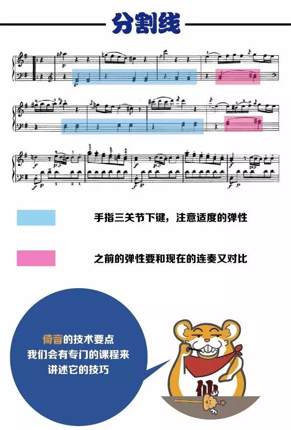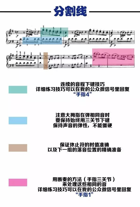 先说一下,我们以后见到的展开部可不会那么短篇,这篇虽短但五脏俱全,除去最后3个小节的连接部分,前面大致也可以分两个不同的音乐素材,大家可以把这个分发作为工作量量化的依据进行练习,关于技巧部分,我们在图文和视频里已经说了,大家记得复习。