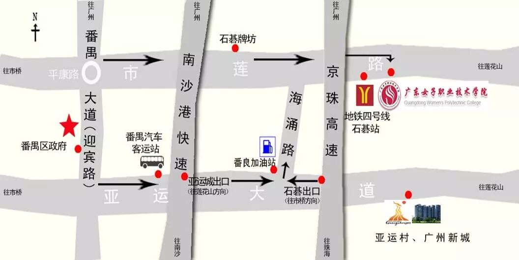 公交路线:番92、番93、番111、番126到石碁地铁站下,可参考红色箭头路线。