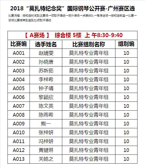 比赛流程:按规定时间到达赛场并到前台签到→领取评语卡及号牌→在场外候场→听从工作人员点录排队→有序进场→按规定就座→比赛→该场比赛结束到签到处领取评语纸。