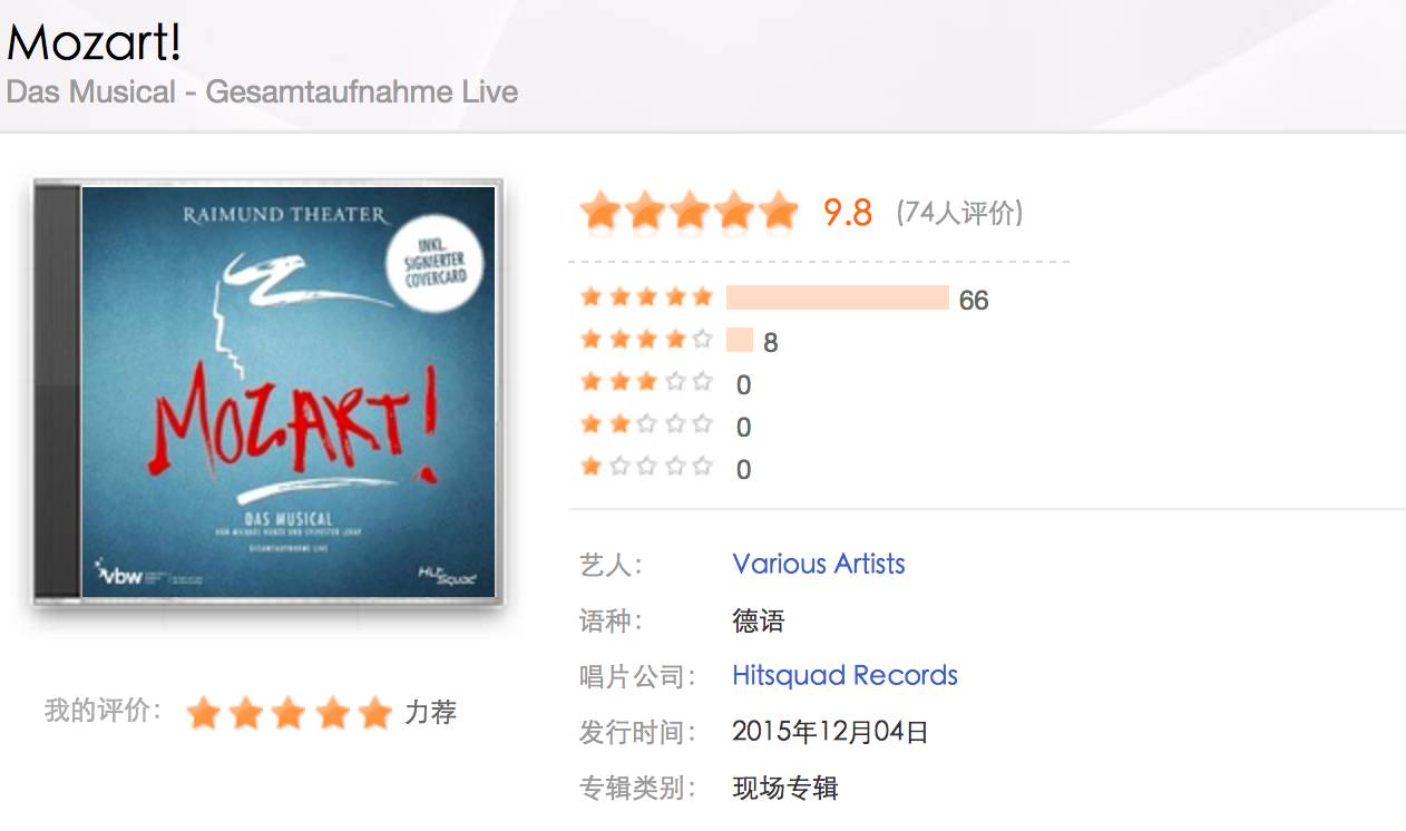 《莫扎特》于1999年在奥地利维也纳首演,在创作问世至今的17年间,《莫扎特》已经有18个版本、超过6种语言、在7个国家上演过。