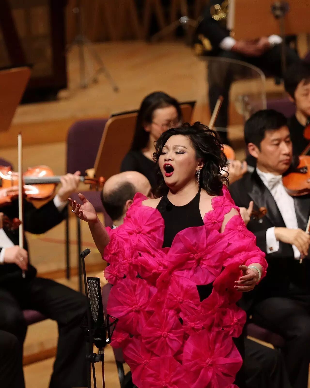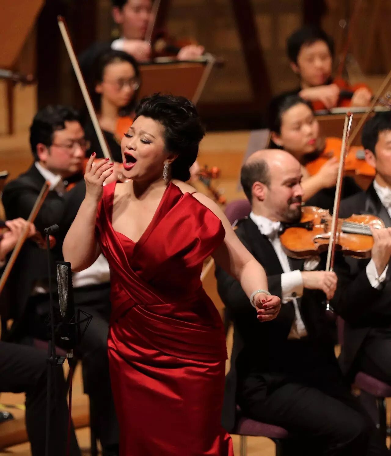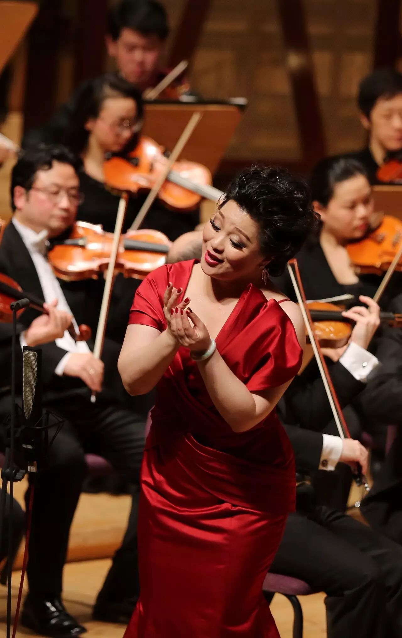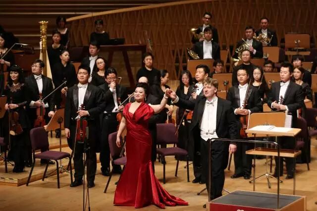 如果说上半场的黄英只是小试牛刀的话,那么下半场就是真正的火力全开!换了一身大红裙的黄英,首先连续演唱了唐尼采蒂歌剧《唐帕斯夸莱》中的“那动人的目光”和罗西尼歌剧《塞米拉米德》中的“希望的曙光”这两首难度极大的咏叹调。乐队演奏后,黄英再次上台,演唱普契尼歌剧《燕子》选段“多蕾塔做了什么美梦”和罗西尼歌剧《塞维利亚理发师》中的咏叹调“我听到一缕歌声”。有意思的是,下半场曲目不仅都是意大利作品,而且内容也都有一个相似的特征,即:心中怀揣爱与希望的少女。黄英的演唱功力在这些抒情与花腔兼有的曲目中充分得到了展现,她的音量不很大,但音色悠扬温柔纯净透亮、花腔技巧娴熟自如,乐句处理极其细腻,现场听来真像是给耳朵在做“SPA”。,我认为并不为过。