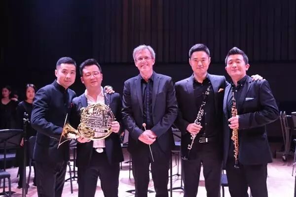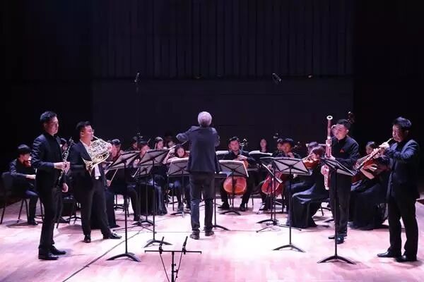下半场由来自萨尔茨堡莫扎特音乐与表演艺术大学的音乐家Wolfgang Redik教授担任指挥,他带领室内乐团与管弦系双簧管教师李佳胤、单簧管教师单小明、圆号教师吉祥、巴松教师杨光联袂演出了莫扎特的《降E大调交响协奏曲》。该作品介乎于交响曲与协奏曲之间,像巴洛克时期大协奏曲一般,由4件独奏管乐器与乐队展开竟奏。四位教师配合得无比和谐默契,时而奏出美妙动听的旋律,时而彰显出丰富华丽的技巧。这首在音乐会上广为演奏的经典作品,经Wolfgang Redik教授一指挥,赋予了全曲轻松愉悦、炫技而又抒情的艺术魅力,使听众如痴如醉,回味无穷。