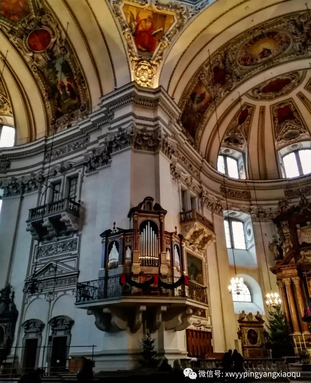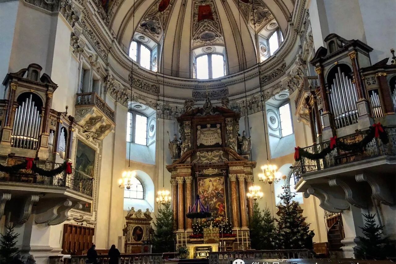 下一步便是参观莫扎特接受洗礼的地方,萨尔茨堡主教堂。距离莫扎特广场不远处,就是萨尔茨堡大教堂。从外观看,是一座略朴素的巴洛克式建筑,但进入到教堂里面,就立刻被它的奢华所惊艳。 除了与一般教堂一样,有一座大的管风琴之外,在典礼台前方还有四个小的管风琴,相互对应,带来完美的对称感。萨尔茨堡不大,教堂