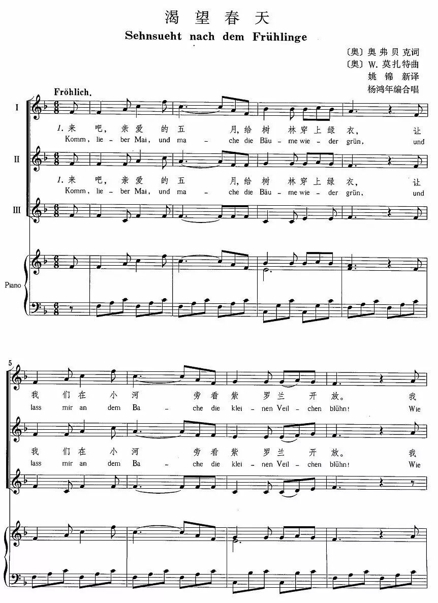 这是一首奥地利歌曲,也是一首世界名歌,奥地利奥弗贝克词,莫扎特曲,姚锦新译配,中央音乐学院教授杨鸿年编合唱谱。