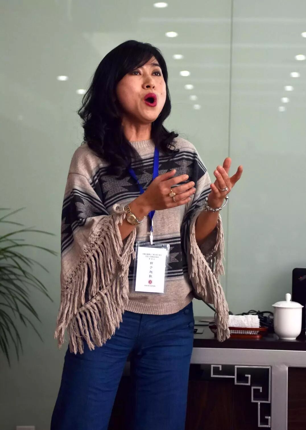 来自海南的赵媛,,曾荣获中国音乐金钟奖半决赛入围奖、CCTV青年歌手大赛海南赛区金奖;连续三届获得海南省金椰奖声乐比赛民族唱法金奖等。她是班里公认的开心果,她就科学的发音方法、歌唱中的语言和语感等内容,以边说边唱的形式让大家感受陕北民歌的韵味。