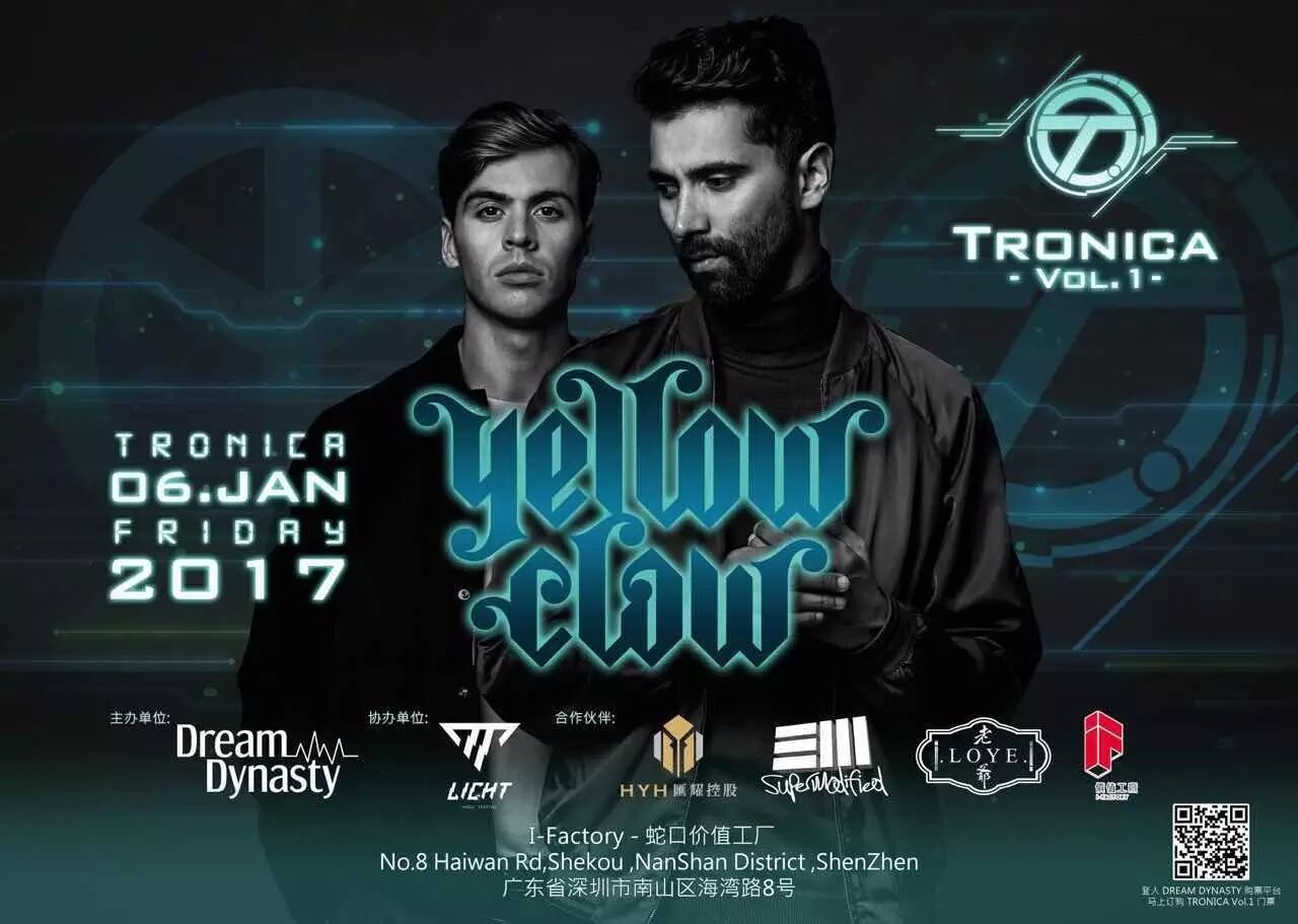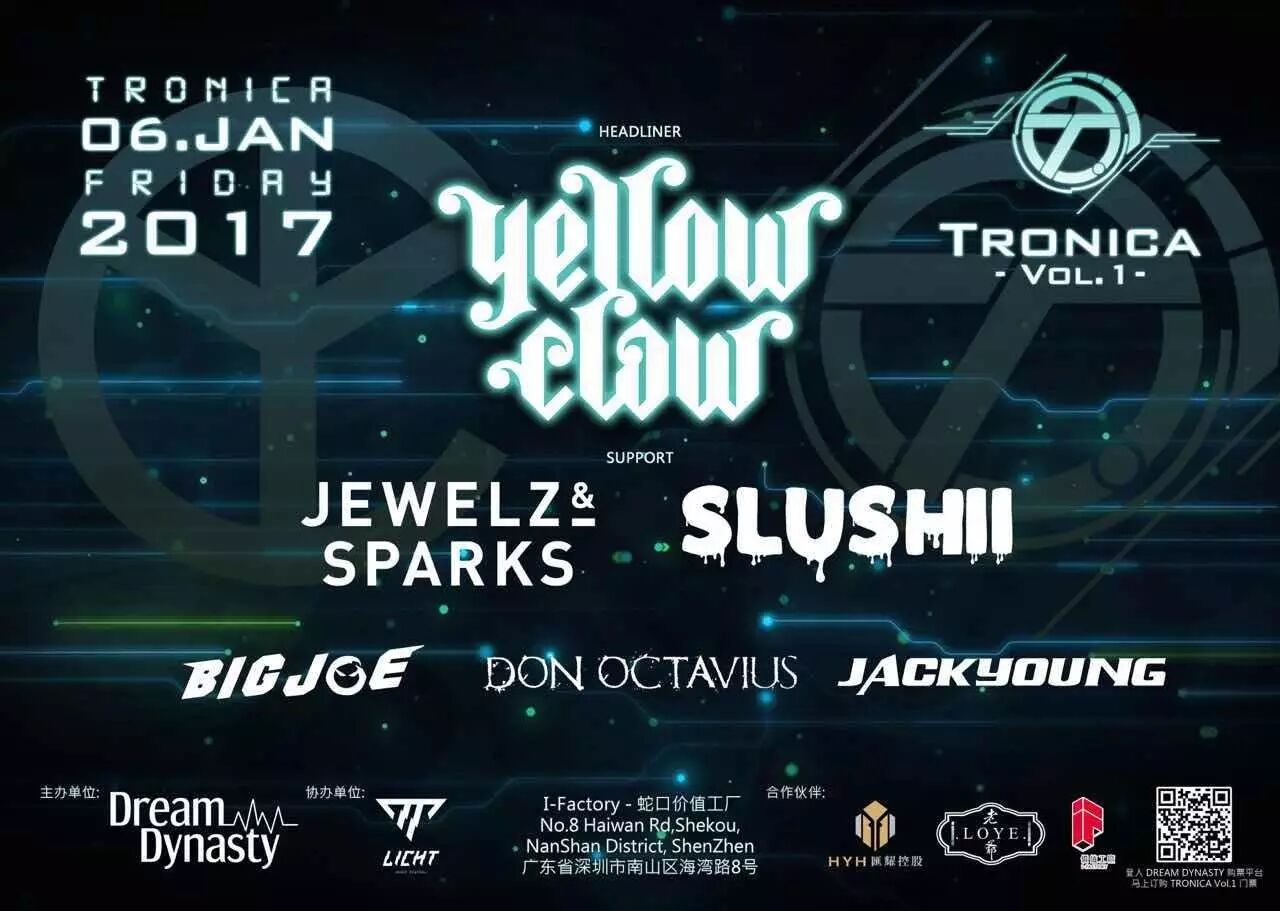 2017.1.6,Yellow Claw随着Tronica Vol.1空降蛇口价值工厂,顶级的视听觉盛宴少不了其他大咖的助力,在一月六号,除了Yellow Claw,还有哪些大咖?下面一一介绍。