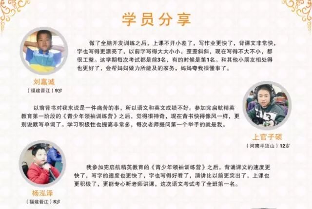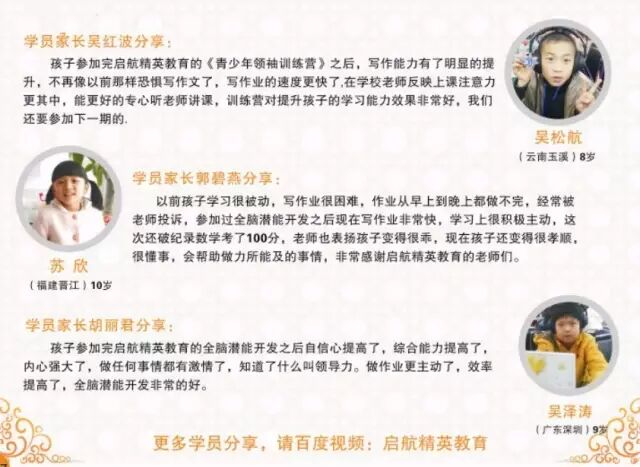 啟航精英教育学习潜能训练机构创立于2013年9月,是国际著名莫扎特脑科学中心在福建的合作运营总部,专注于青少年综合能力训练,以儿童神经科学和心理学为基础,全面开发青少年儿童的专注力、理解力、记忆力、创造力、行动力、控制力等综合能力。