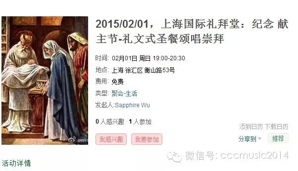 圣诞节过后40天(2月2日)是献主节(又称“奉献基督于圣殿日”或“圣烛节”)。2月1日晚,上海国际礼拜堂将举行礼文式圣餐颂唱崇拜。届时将演唱《圣体颂》等经典圣诗。日前,该堂晚礼拜诗班通过豆瓣同城发布活动信息,邀请教内外朋友参加。