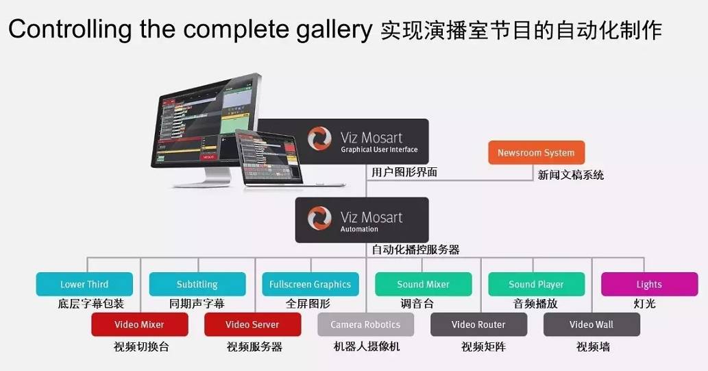 作为自动化制作解决方案的核心,Viz Mosart自动播控系统担任了“大脑”的角色,通过TCP/IP,Midi,422串口等标准化链路,演播室内多类制作工具均接入到Mosart系统平台,并且采用类似时间线窗口的方式,将节目铺设到简洁明了的操控面板,由导播掌握节目内容的录制进度完成自动化制作。