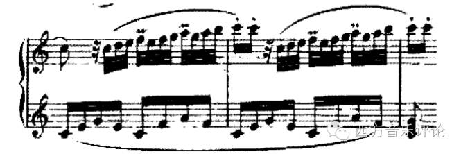 上述的两个小节中的第二拍,右手要在一拍内迅速地弹奏出十二个音符。如果没有收拢整个手掌,依靠指尖作为发力点去触键的话,弹奏出来的音色就会显得“松软”。尤其是四指经过时。同时手腕的动作不能过分的翻动,应当柔顺地随着手指位置的变换而移动。注重呼吸,力量应在波浪型的起伏中形成长的气息。