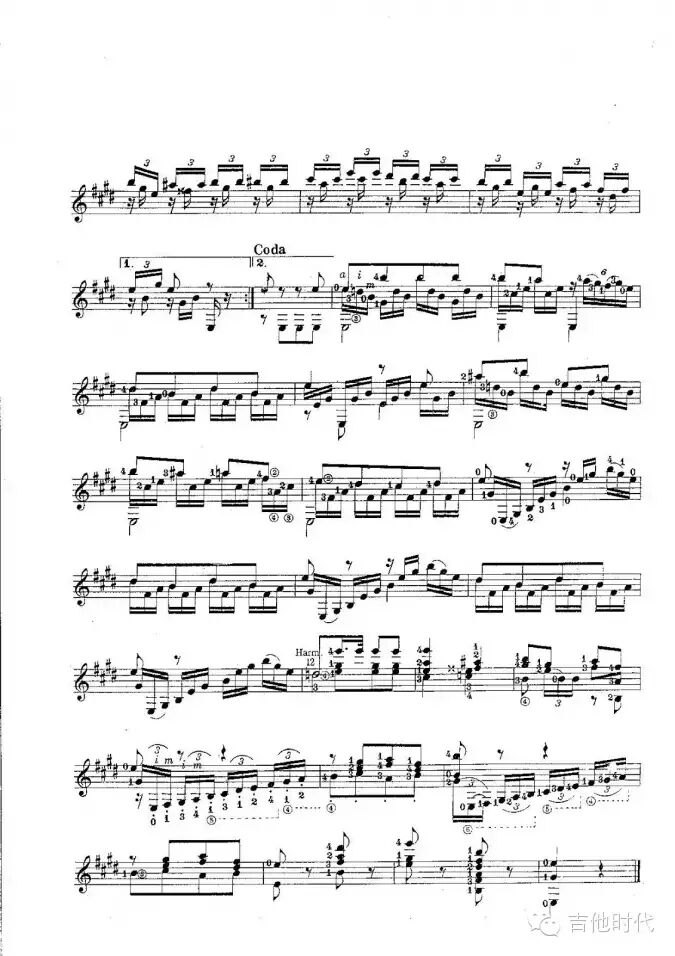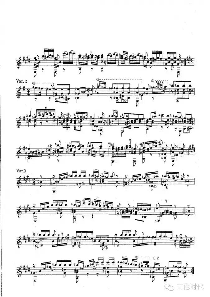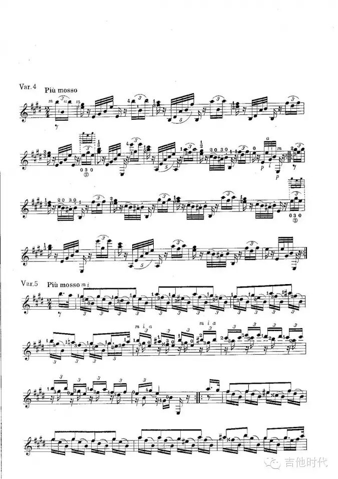 第五变奏也是装饰【严格】变奏的进一步延伸,既保留了“音乐神童”莫扎特【魔笛主题】的基本结构,又维持了旋律及和声的基本框架,使用更加灵活的变奏,把旋律舆和声用三连音的节奏来丰富表现。是主调音乐时期变奏曲式最常见也是最具有代表意义的表现手法之一。对于有着“吉他上的贝多芬”,“吉他上的车尔尼”美称的作曲家,吉他演奏家费尔南多·索尔而言,这样的作曲手法可谓得心应手。因为他不仅是古典吉他作曲家和演奏家,他还进行了大量的歌剧,舞剧,交响乐和歌曲的创作。所以他的作品当中都有这些艺术的原素,大气磅礡而细腻抒情。风格多样,变化多端!