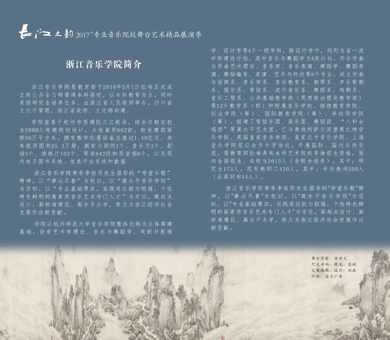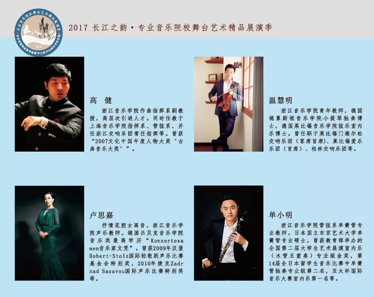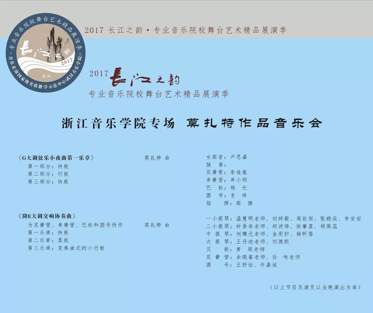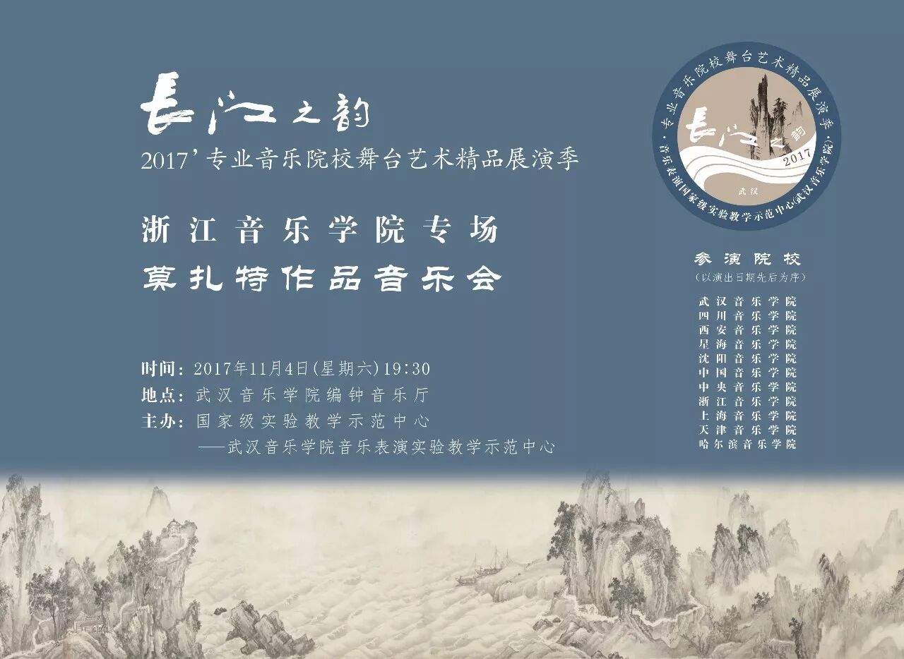 11月4日晚7时30分,“长江之韵”2017专业音乐院校舞台艺术精品展演季浙江音乐学院专场莫扎特作品音乐会将在武汉音乐学院编钟音乐厅上演。