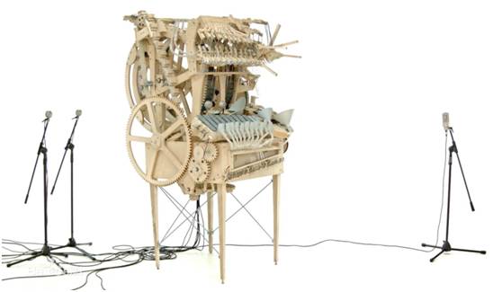 也有一些音乐人不满足现有物件,自己亲力亲为制作乐器。瑞典的音乐人兼发明家Martin Molin曾经就自己制作了一台奇葩乐器。通过摇臂,齿轮和杠杆联动就可以推动乐器内的2000多颗钢珠滚动敲击颤音琴、鼓和吉他等组件来演奏音乐。