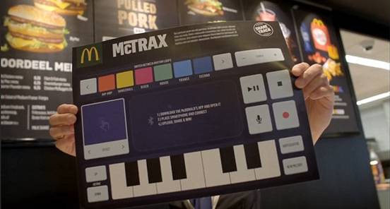 科技带来的音乐改变有时在我们生活中也是触手可得。2016年荷兰快餐店内,通过特殊的油墨印刷技术将声音采集器集合在餐盘垫纸中。