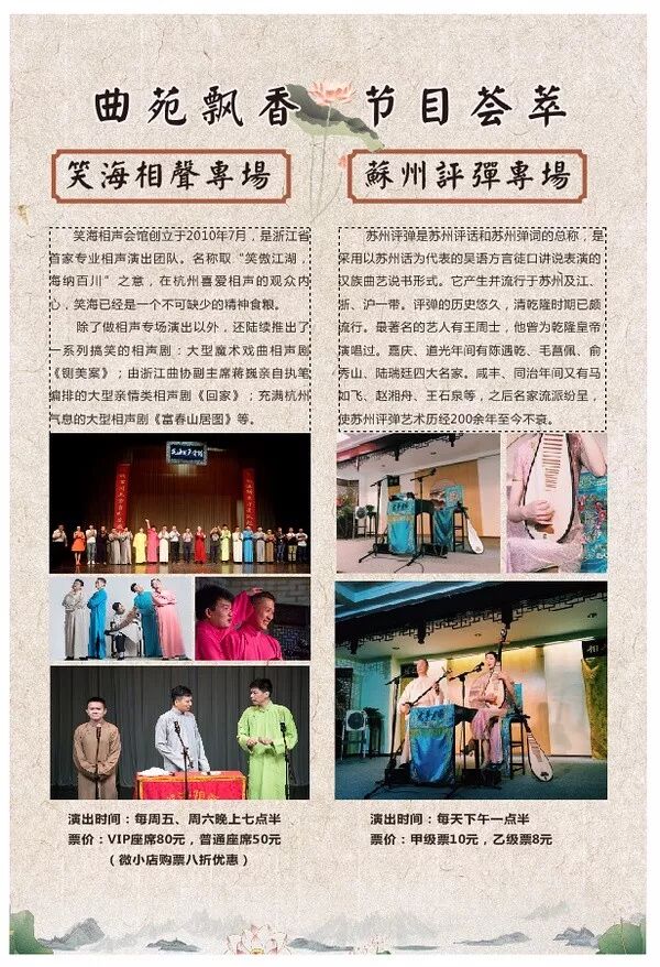 | 简 介 | :笑海相声会馆力创"南派相声"将传统相声和现代时尚文化元素相结合融入了许多戏曲、话剧等技巧,创作出众多全新的相声节目。如《恋爱幸福》《双叶争哏》《杭州爱情》《新五行诗》《异想天开》《80后的记忆》《印象水浒》等。全新的相声剧《铡美案》《家有喜事之2011》《新白蛇传》等。