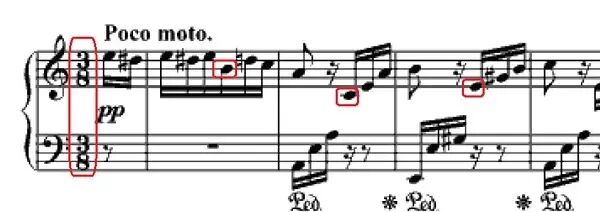我们先来看看这首曲子的拍号,3/8拍。每个小节有3拍,每两个十六分音符数一拍。但是如有不慎,一旦把圈出的这些音符弹成重音,就会将它变成6/8拍。而且这些音符正好是右手进入的音符,特别容易弹成重音。3/8拍流动性强,6/8拍则有种闲庭信步的感觉,拍子错了,整体感觉就不一样了。 理查德·克莱德曼有一个改编的《致爱丽丝》,就是6/8拍,如果听习惯了这个版本再来弹原版,就更加容易先入为主,把节拍弹错。