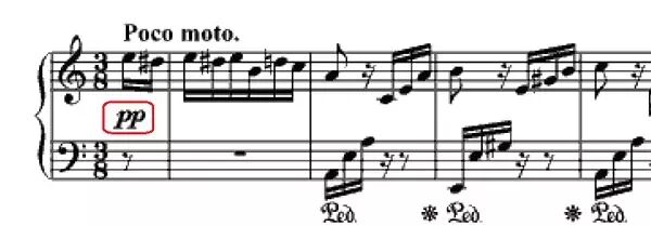 一开始,表情记号是pp。由于大家对这首曲子的旋律太熟悉了,太多的人忽略了这个细节。pp不是一般的弱,而是格外的弱。要求主题开始的时候,声音藏起来,像是说悄悄话一样。最好加上左踏板,效果会更明显。