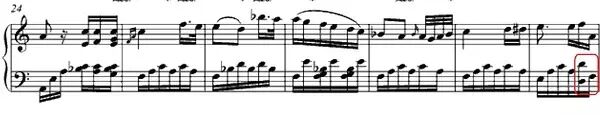 《致爱丽丝》的第二段转为F大调,比起第一段更加明朗、开放。被圈出音符的那个小节之前,连续五个小节都是只有一个和弦,但此小节,却在第三拍改变了和弦,一小节里有两个和弦,和声节奏变化了。这个小小的和弦改变,就像一个转瞬即逝的微笑一样,如果能弹出它的色彩,会非常动人的。