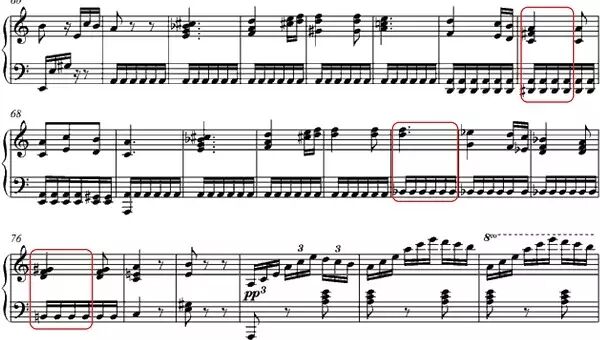 《致爱丽丝》的第三段,是很有戏剧性的。调性转回a小调,低音重复的主音A构成压抑不安的背景。右手的和弦是主旋律。第一个圈,是一个特别黑暗恐怖的和弦,功能是重属,性质是减七和弦。为什么那么恐怖呢?可能是低音的#D造成的效果吧。第二个圈,应该是全曲最明亮的一个地方,在a小调中出现降B大三和弦,是那不勒斯和弦,有一种挣脱束缚、奔向光明的感觉。而在第三个圈中,又出现了一个暗色调的减七和弦,和前面的光明形成光影对比。