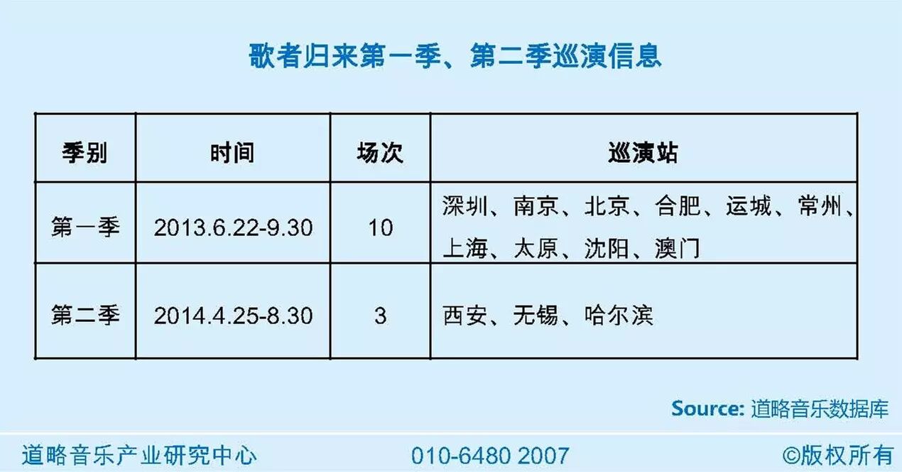 在线下演唱会的开发上,《我是歌手》第一季在2013年4月结束之后,就于6月开启了全国巡演,演唱会由达意美施全程主办,第一季的巡演也比较给力,全国共走过10站。但后续两季的巡演,变得似乎没那么顺畅,第二季只有3场,时间跨度也非常大,而第三季呢,我们至今暂未看到巡演信息。