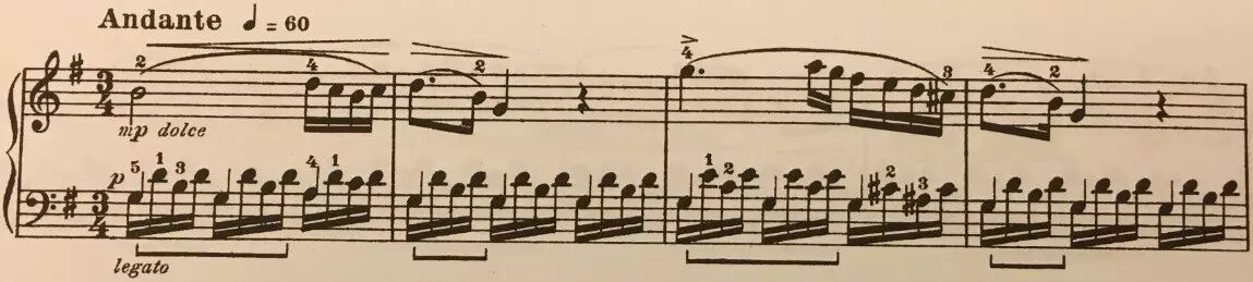 乐章调性为G大调,3/4拍,速度是行板(Andante),以复三部曲式写成: