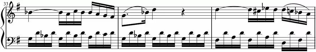 我能想起来的键盘作品,似乎除了这个乐章以外,好像也只有一些小奏鸣曲或者车尔尼那些让人狂吐槽的练习曲,才会由头至尾都采用这么单一的阿尔贝蒂低音写作的。
