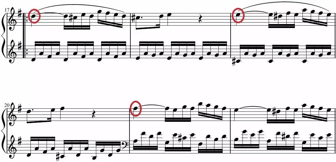 第17-24小节,音乐转至D大调(属调),有一种升华般的感情,三个乐句(17-18、19-20、21-23)不断地向上攀升,从re,到mi,再到fa,一层一层往上,代表着情感的越加激动: