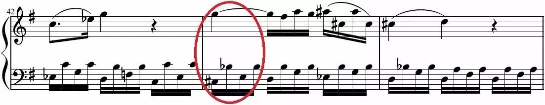 这段音乐压抑而彷徨,特别到了第43小节的减减7和弦(下图圈红处),让这种压抑到了一个无以复加的地步,彷如窒息一般: