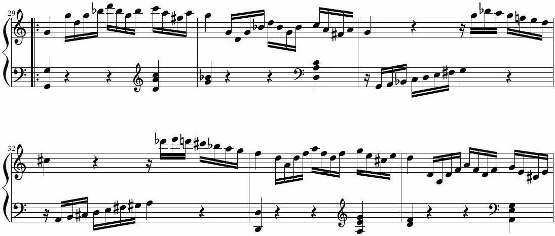 主部在C调的V级和声上终止,经过了一个小节的左手颤音短连接以后,副部几乎是在毫无准备的情况下突然闯入。