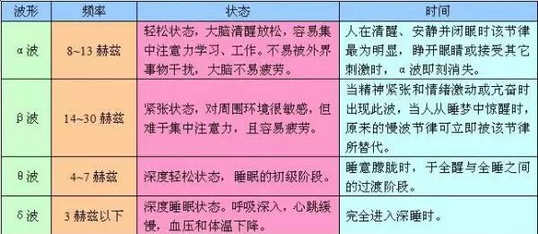 实验研究证实,大脑有四种不同的脑电波:成年人在极度疲劳、昏睡或麻醉的状态下,可在大脑记录到δ波;在受挫、抑郁或刚睡着的时候,可在大脑记录到θ脑波;在精神放松、清醒专注学习的时候,可在大脑记录到α脑波;在精神比较紧张和情绪比较激动亢奋时,可记录到β脑波。