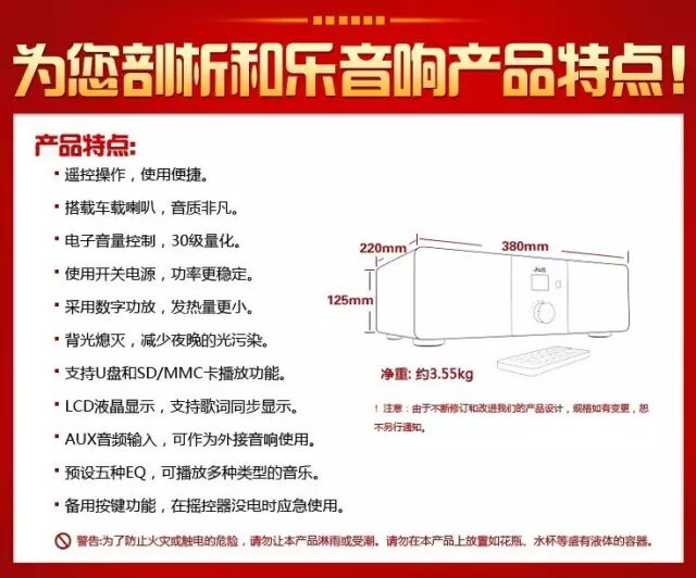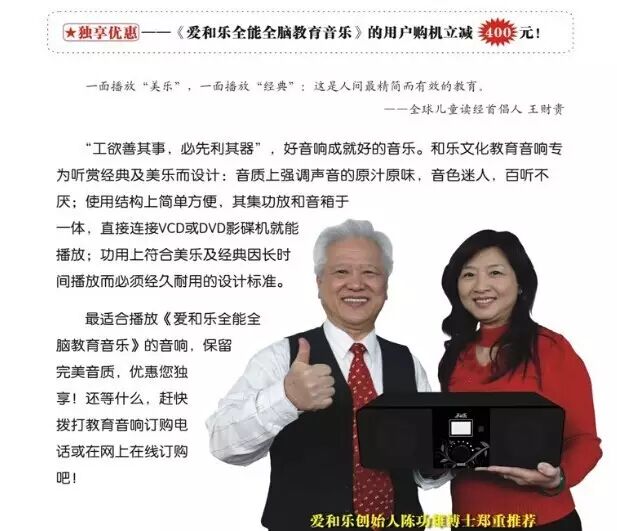 和乐A3文化教育音响为爱和乐用户专用音响,由爱和乐公司自主研发,从外形、功能、音质、材质等方面考量,专为播放《爱和乐全能全脑教育音乐》与经典朗读录音而制,具有以下特点: