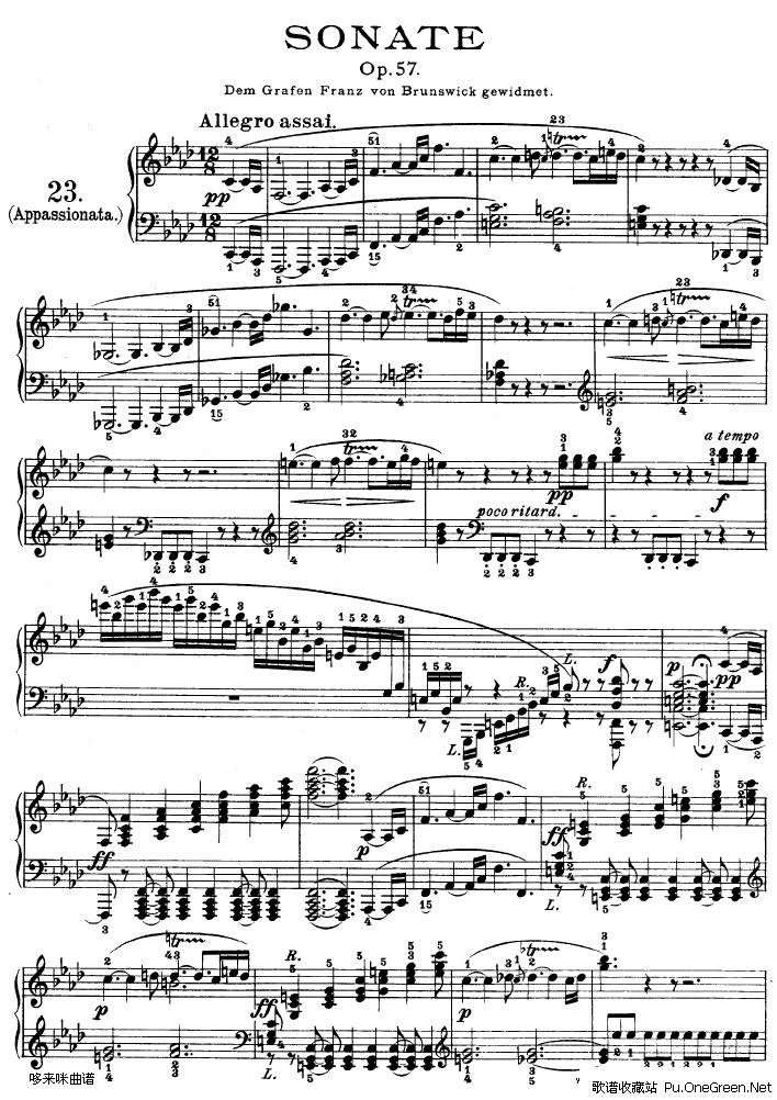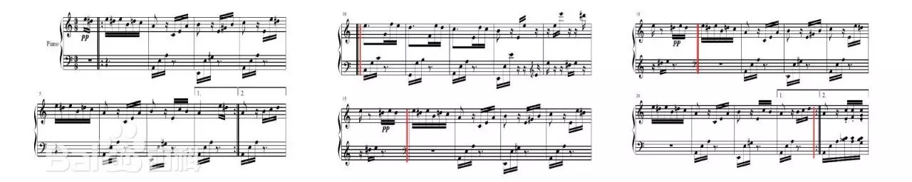 我们知道,在分析古典奏鸣曲呈示部时,往往都会找第一个反复记号,第一个反复记号之前的全部为呈示部。但在《热情》中,贝多芬却把这个反复记号省略了,这不能不说是贝多芬对“古典框框”的背叛和创新。当然,本曲呈示部的不反复主要还是乐曲内容发展的结果。