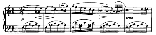 随后是一个连接句,右手采用琶音连续上行,由慢渐快,低声部采用和弦推动音乐的发展,仿佛是少女欣然接受了他的表白。在最高音处,一连串的半音阶下行,充满华丽的色彩,表现出两人心心相印的幸福感受。