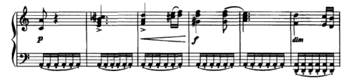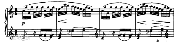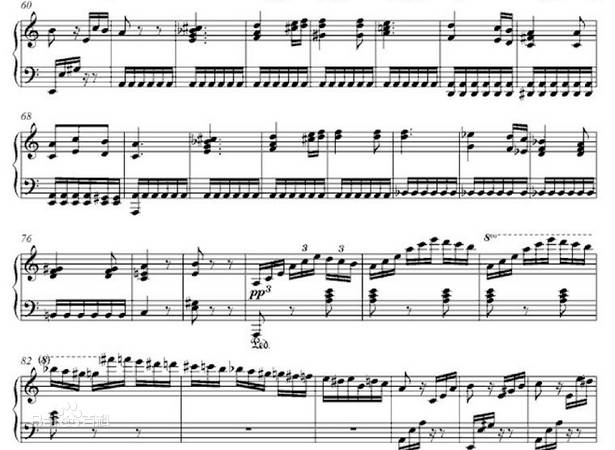 在最后,贝多芬又安排了从导7和弦到主6和弦再接上属7和弦的连接,接后是一个由主3和弦所构成的带有华彩性质的“曼海姆火箭”音型,作为第二插部回归叠部时的一个连接部分。