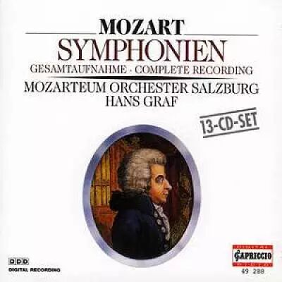 当然,这些“遗珠”录制的机会很少,绝大多数指挥家还是只搞1-41那个体系内的莫扎特交响曲。少数对莫扎特作品有特别兴趣的指挥家会去录“遗珠”,比如德国Capriccio牌子就有Hans Graf录制的编号41之后的交响曲,乐团是萨尔兹堡莫扎特乐团(Mozarteum Orchestra Salzburg),他的这套全集一共13CD。