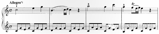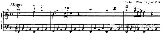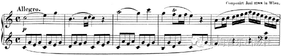 我们拿K.545第1乐章的开头做例子,莫扎特在这里只写下了最简单的音符,外加两个小连线,没有任何的力度,乐谱只把这些最直观的东西表现出来,就是所谓的“净版”了,比如亨乐版(Henle)的乐谱: