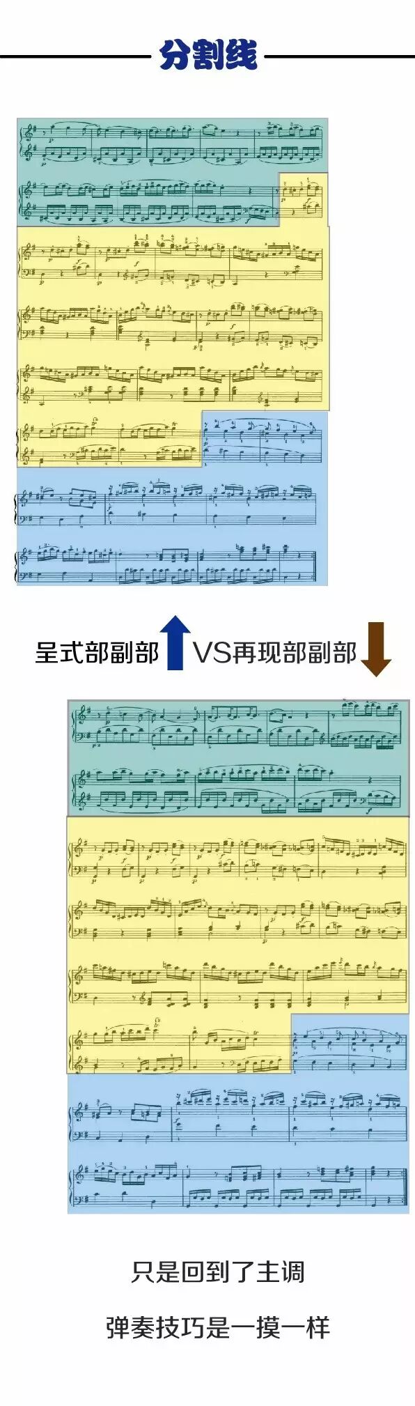 再现部虽然和呈式部大致一样,在一些考试和一些比赛的初试中也虽然会被评委们中断,但是它却是一部完整的奏鸣曲中不可缺少的部分,学习者如果在时间允许条件下,要挖掘“重复”片段中不一样的地方,另外就是对调性不清楚的学习者们,后有可能在背谱的时候,将呈式部和再现部搞混,因为的确是在一些衔接部位,有着太多的相似(乐句,指法),所以大家一定要认真对待。