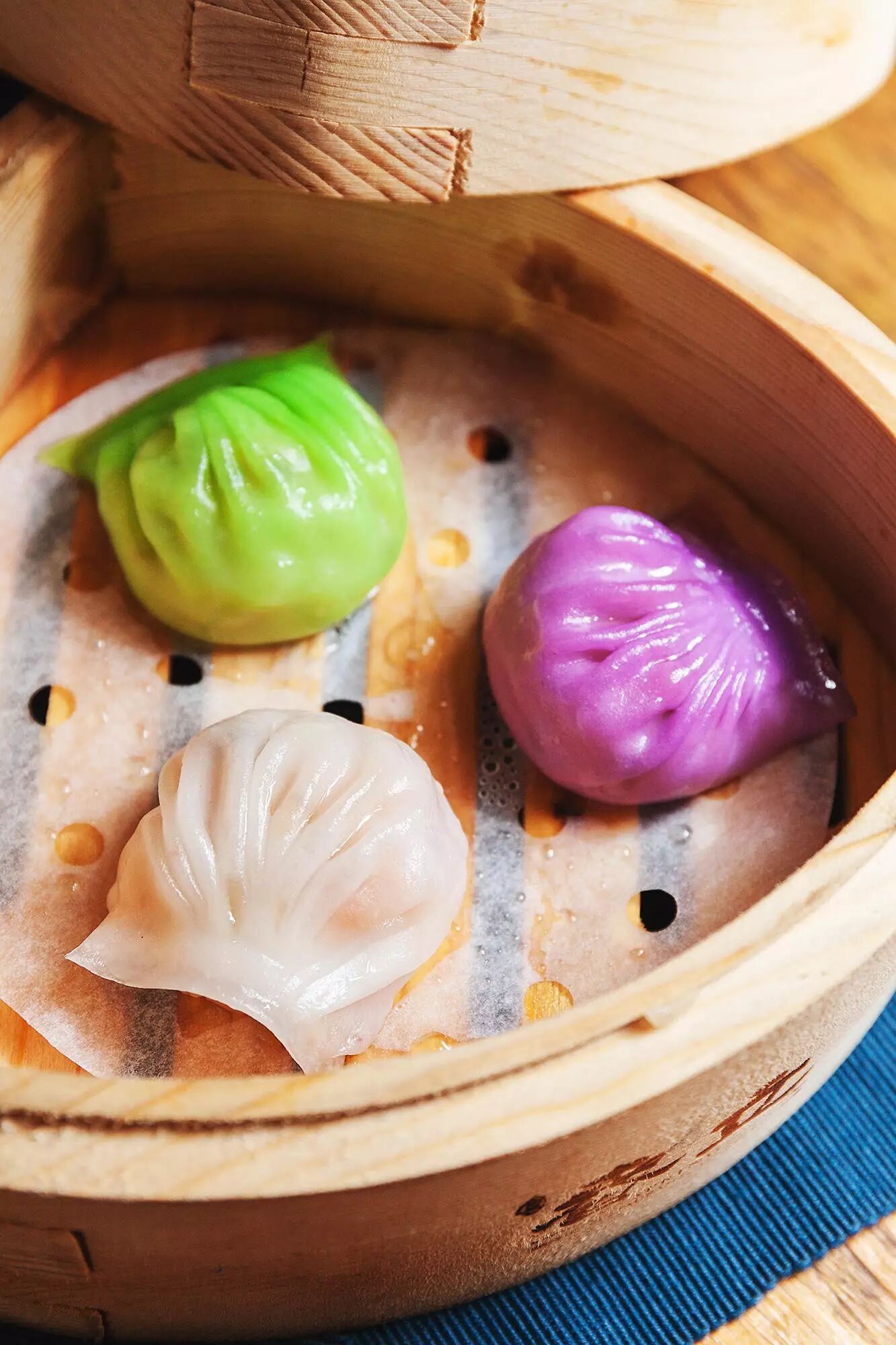 “虾饺”绝对是广东早茶中不可缺少的存在,这款三种的颜色的虾饺,以菠菜汁、紫米浆融入虾饺皮中,这颜值我给满分!
