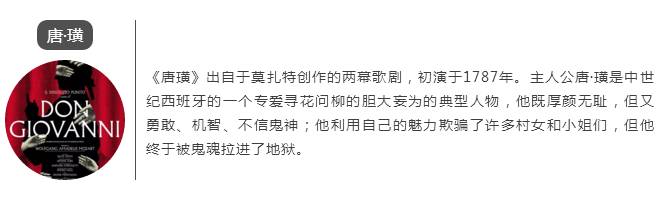 唐璜可能是歌剧史上独一无二的角色,他对女性的追求已经达到疯狂的地步。无论是粗鲁无知的村姑女佣还是贵族家庭的千金小姐,按照芳名册上记载的2000多个女子,令人难以置信。可以说,这是一个从人转变成野兽的角色。也有人认为这是莫扎特自己对自己的诅咒,在奥斯卡获奖影片《莫扎特传》中也有类似的表达。