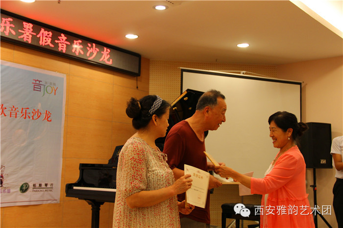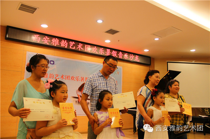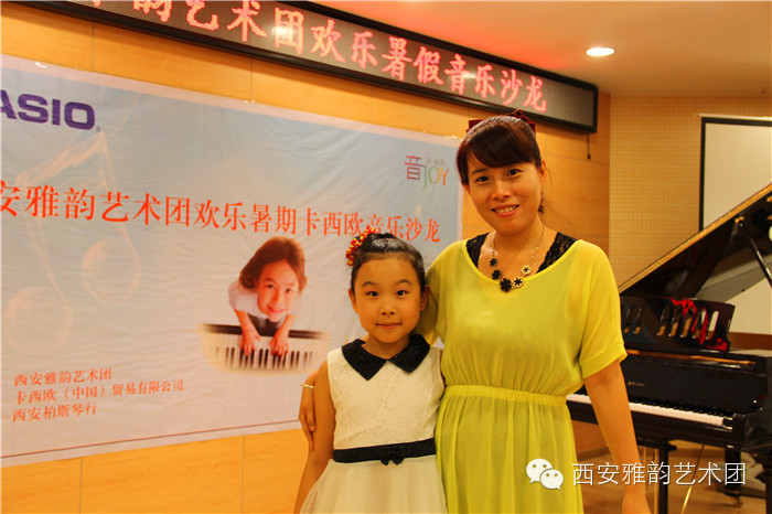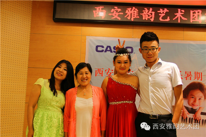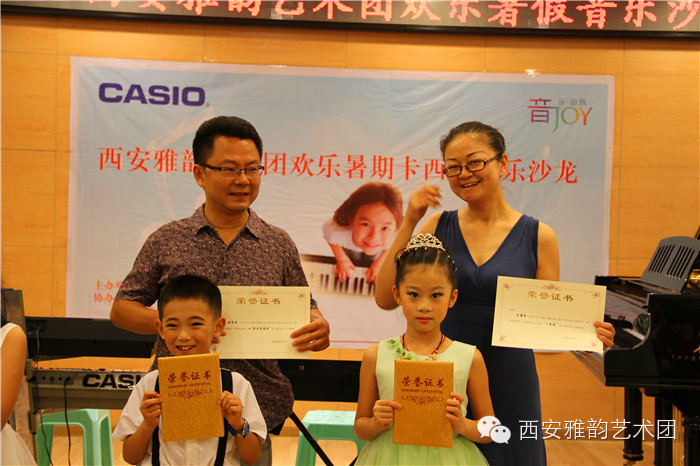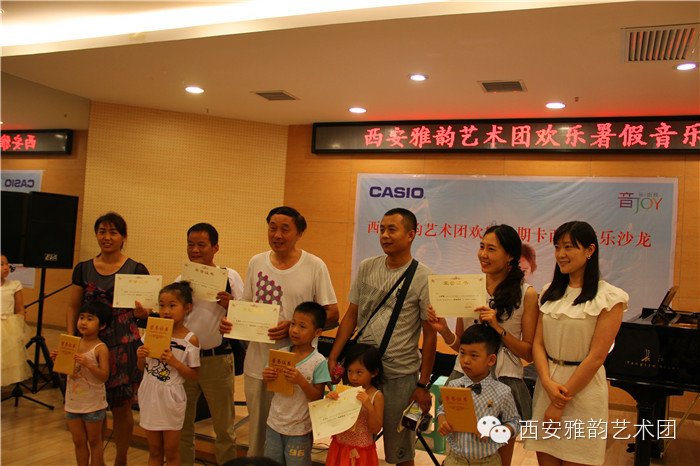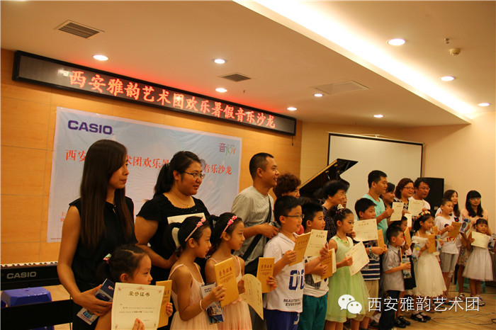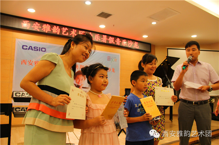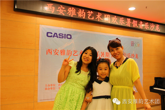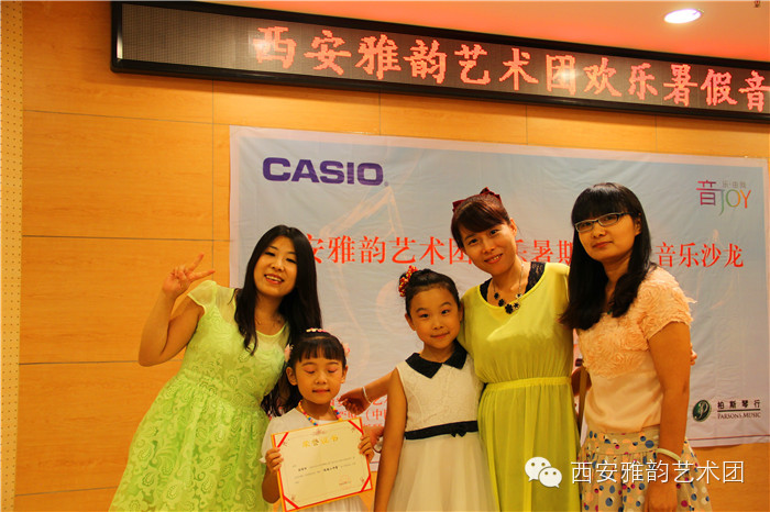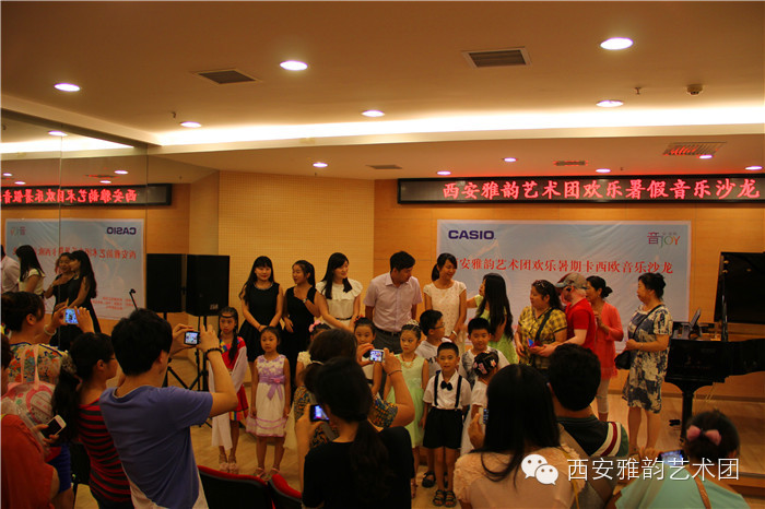 2014年西安雅韵艺术团暑期音乐沙龙完美收官!本次活动彰显了社会力量办学的优势及创新,受到业界一致好评!尤其是西安雅韵艺术团先进的教学理念,创新的教学模式——“家庭互动式教学”更是得到莅临本次活动领导的一致认可及高度赞赏。本次活动更是得到各单位的高度重视和鼎力协助!出席本次活动的有西安音乐学院知名讲师——姚婧老师、梁静老师,西安信德中学团委领导——张慧老师,卡西欧(中国)贸易有限公司西安分公司领导——王君宏课长,卡西欧(中国)贸易有限公司西安分公司领导——张璐主任,西安柏斯琴行文艺路店店长——谢淑梅女士,西安柏斯琴行小寨店店长——陈宏凌女士。