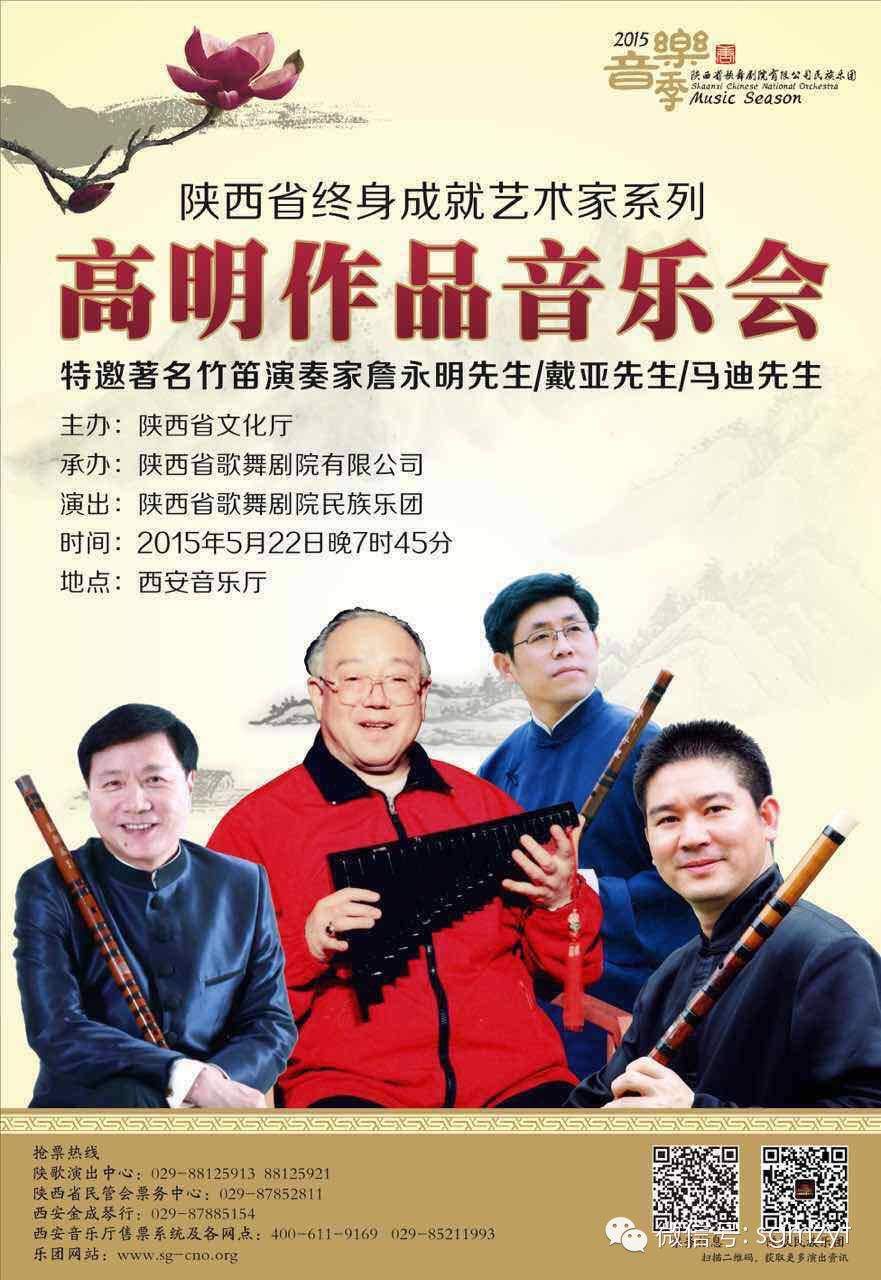 由陕西省文化厅主办,陕西省歌舞剧院有限公司承办,陕西省歌舞剧院民族乐团演出的《陕西省终身成就艺术家系列·高明作品音乐会》,特邀著名竹笛演奏家戴亚先生、詹永明先生、马迪先生领衔与乐团合作,倾情演绎、联袂奉献。旨在进一步弘扬陕西文化艺术,推动陕西文化大繁荣大发展,褒奖为陕西文化事业默默奉献,并有突出贡献的艺术家。