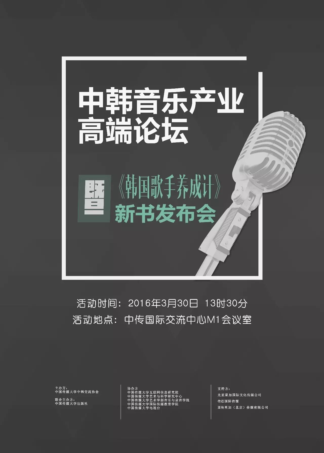 此次论坛作为中国传媒大学中韩文化产业系列交流活动之一,将于2016年3月30日(周三)下午1:30在中传国际交流中心M1举行。