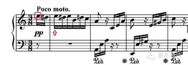 第二个细节仍然在节奏方面。请注意,这首曲子的主题部分是弱起的,进来的时候是第三拍,从第三个音开始才是正拍。如果你把第一个音弹得太重太肯定,那么第一小节连同前面的弱起小节就会变成一个四拍子的感觉。这样,音乐刚开始时节奏不明,会让人完全摸不着头脑。如果在第三个音,也就是箭头指向的那个E上做一个小小的拍点推动感(不要过分),节拍关系会从一开始就很清楚。