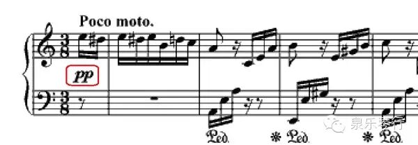 一开始,表情记号是pp。由于大家对这首曲子的旋律太熟悉了,太多太多的人忽略了这个细节。pp不是一般的弱,而是格外的弱。要求主题开始的时候,声音藏起来,像是说悄悄话一样。最好加上左踏板,效果会更明显。