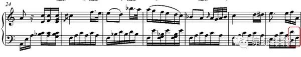 《致爱丽丝》的第二段转为F大调,比起第一段更加明朗、开放。被圈出音符的那个小节之前,连续五个小节都是只有一个和弦,但此小节,却在第三拍改变了和弦,一小节里有两个和弦,和声节奏变化了。这个小小的和弦改变,就像一个转瞬即逝的微笑一样,如果能弹出它的色彩,会非常动人的。