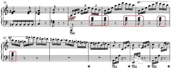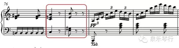 这个细节和刚刚那个细节恰好是可以相互印证的。还是我们前面讲过的原则,音乐在音符少的地方。右手的长琶音只是和声背景,别忘记还有个pp告诉你一定要弱。左手的和弦敲出什么样的节奏呢?我觉得像心跳,这就和前面那个惊魂未定对应上了。