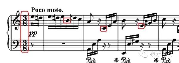我们先来看看这首曲子的拍号,3/8拍。每个小节有3拍,每两个十六分音符数一拍。但是如有不慎,一旦把圈出的这些音符弹成重音,就会将它变成6/8拍。而且这些音符正好是右手进入的音符,特别容易弹成重音。3/8拍流动性强,6/8拍则有种闲庭信步的感觉,拍子错了,整体感觉就不一样了。
