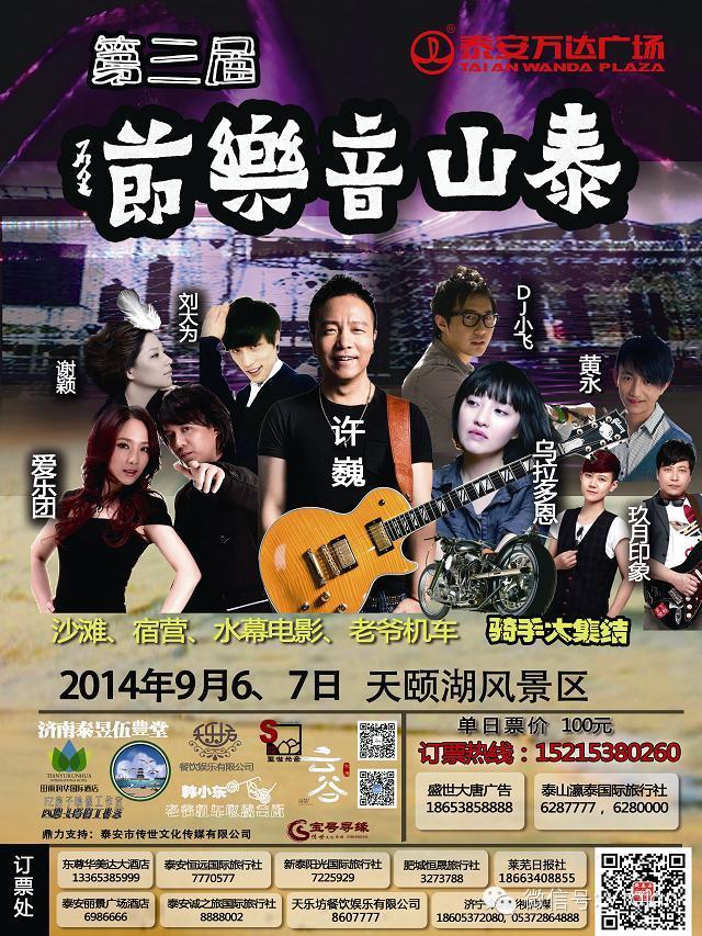 近年来国内外音乐节云集,这一演出形式近几年越来越多地进入人们的视野,国外的伍德斯托克音乐节(Woodstock Rock Festival)、伦敦城市音乐节(City Showcase)、国内的草莓音乐节、迷笛音乐节都是音乐节中的代表,每年都有几万人蜂拥至音乐节享受音乐、挥洒激情。9月6日、7日,泰安将迎来属于自己的音乐节——泰山音乐节。在风景优美的泰安天颐湖风景区,许巍、爱乐团、乌拉多恩、中国好声音学员,中国好歌曲学员等知名歌手将为泰安乐迷带来精彩的演出。同时,这也是全世界为数不多的沙滩音乐节之一。